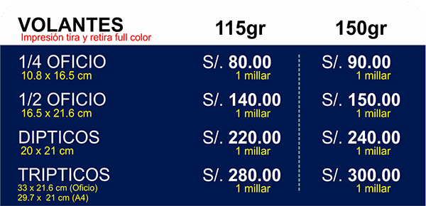 Hacemos el trabajo de impresión y diseño de volantes en Full Color, ambas caras en papel de 115gr y 150gr el servicio incluye el delivery a su hogar u oficina.